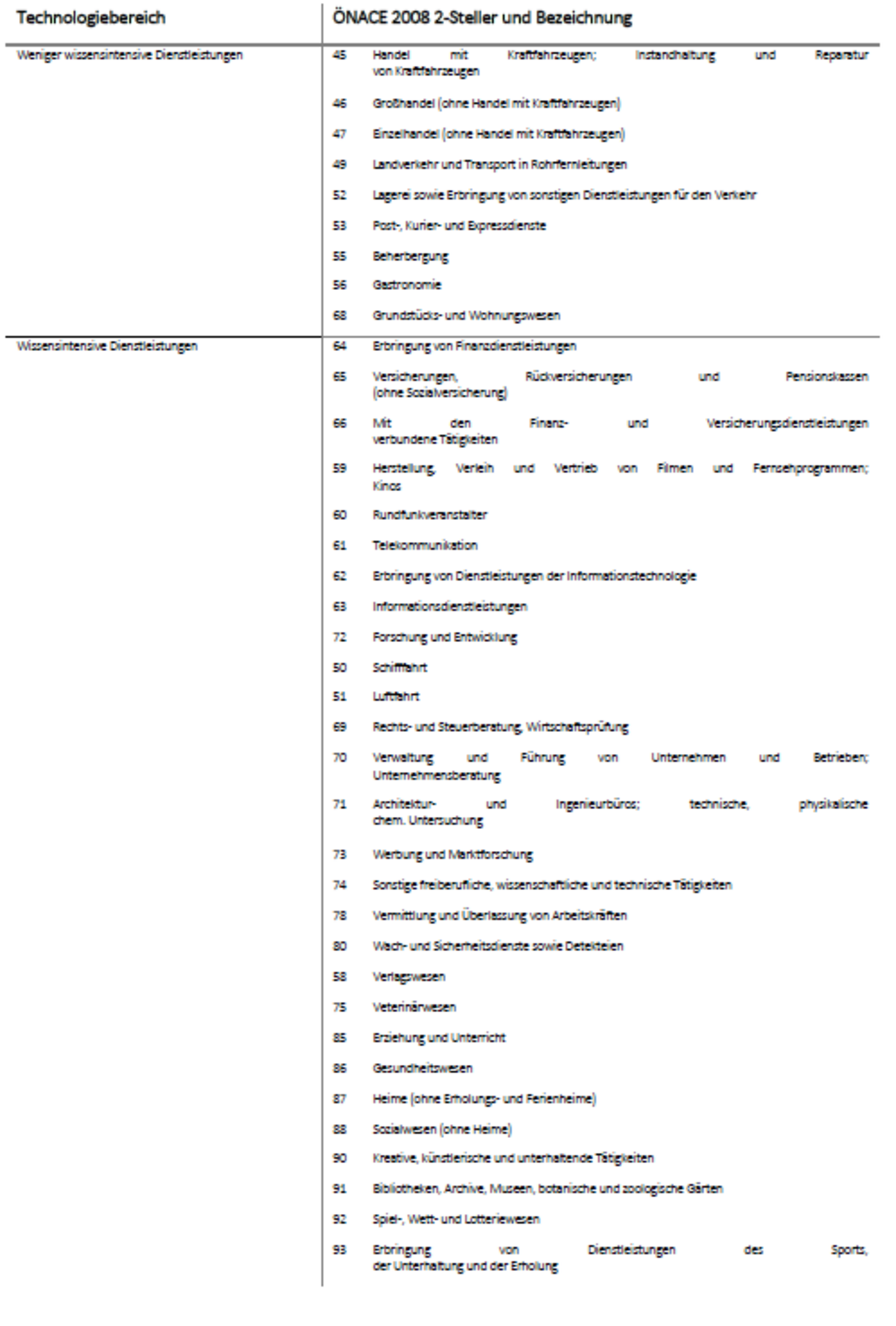 Der Dienstleistungsbereich lässt sich ebenfalls in wissensintensive und weniger wissensintensive Bereich einteilen, wobei die ÖNACE-Klassen wie folgt eingeteilt sind: