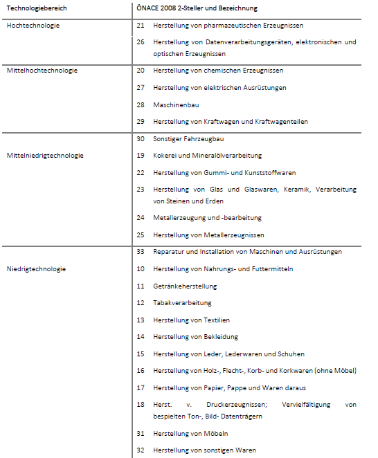 Die Technologiebereiche der Produktion lassen sich in die Kategorien (i) Niedrigtechnologie, (ii) Mittelniedrigtechnologie, (iii) Mittelhochtechnologie und (iv) Hochtechnologie einteilen, wobei die folgenden ÖNACE-Klassen zugeordnet werden können: