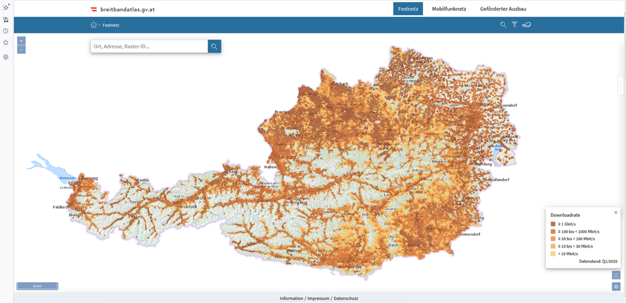 Österreich hat in den vergangenen Jahren erhebliche Fortschritte beim Ausbau des Festnetzbreitbands erzielt. Der Versorgungsgrad mit Festnetzinternet von mindestens 100 Mbit/s lag im ersten Quartal 2025 österreichweit bei 90,1% der Bevölkerung. Die gigabitfähige Versorgung (≥ 1 Gbit/s) erreicht rund 71,4% der Einwohner:innen. Besonders hohe Werte verzeichnen bevölkerungsreiche Bezirke wie Wien, Linz, Graz und Innsbruck – aber auch Dornbirn, Eisenstadt, Mattersburg, Mödling, Neusiedl am See, Rust, Sankt Pölten, Steyr, Waidhofen an der Ybbs und Wels (Stadt) – mit Versorgungsgraden von über 90%. In peripheren Bezirken im Süden Österreichs – etwa in Völkermarkt, Villach Land, Spittal an der Drau, Feldkirchen, Südoststeiermark, Voitsberg und Klagenfurt Land – verfügen hingegen weniger als 30% der Bevölkerung über eine gigabitfähige Festnetz-Internetversorgung.