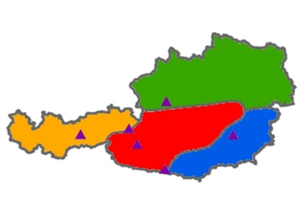 Die nachfolgende Darstellung der historischen Zeitreihen nutzt die regionale Einteilung der Messstationen von HISTALP, wobei zwischen Nordösterreich (grün), Südostösterreich (blau), Westösterreich (orange) und dem inneralpinen Raum (rot) unterschieden wird (vgl. rechte Abbildung).