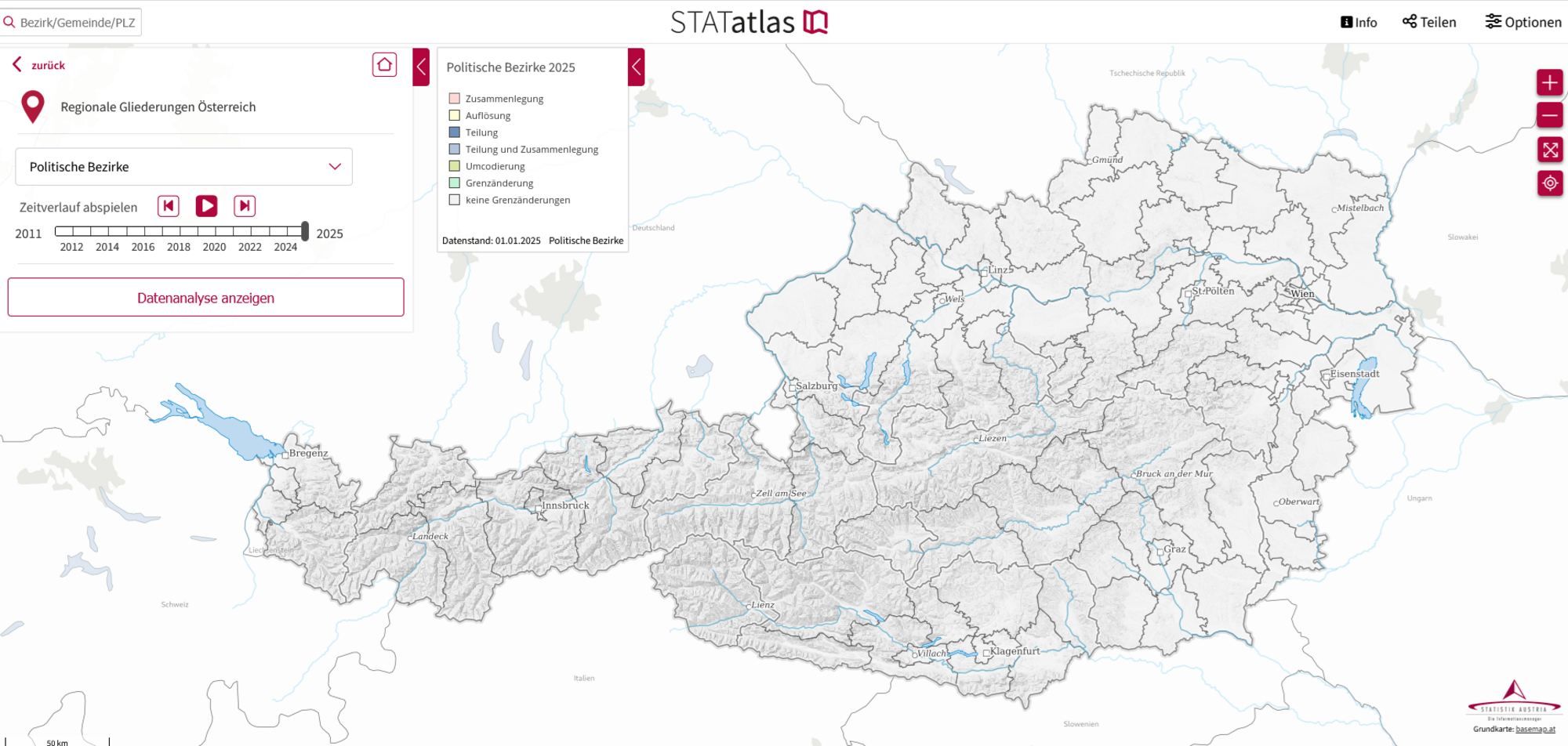 Unter diesem Link finden Sie eine genauere Darstellung der Statistik Austria der regionalen Gliederungen und Gebietsstandsänderungen für Österreich.