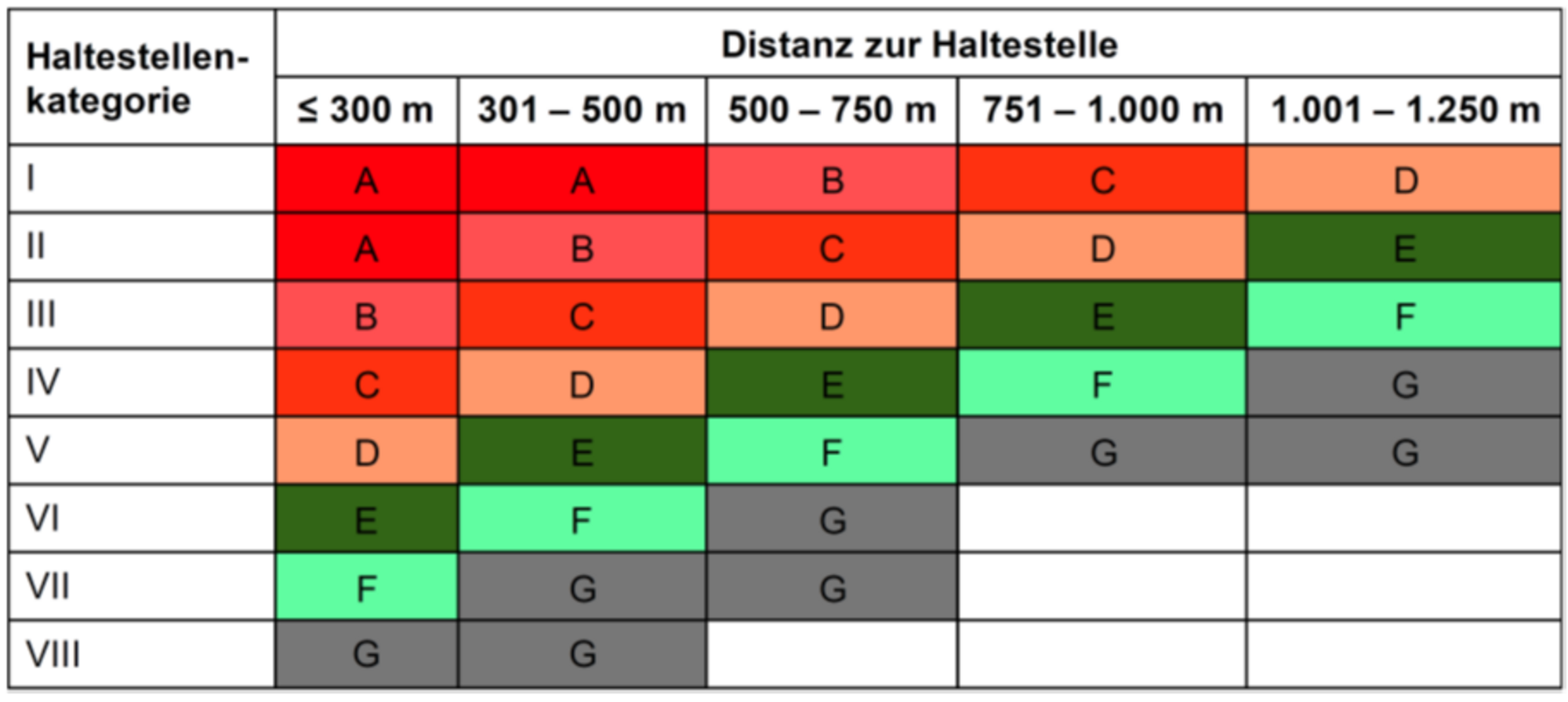 Die Güteklasse A steht für die höchstrangige ÖV-Erschließung in einem städtischen Raum, sie ist gekennzeichnet durch ein dichtes Netz, hohe Taktdichten und einer Verfügbarkeit von mehreren unterschiedlichen Verkehrsmitteln. Es folgt Klasse B, mit einer hochrangigen Erschließung, wiederum in einem urbanen Umfeld. Die Buchstaben C und D beschreiben eine sehr gute bzw. eine gute Erschließung in städtisch/ländlichen Übergangsbereichen mit ÖV-Achsen oder ÖV-Knoten. Für den ländlichen Bereich wurden drei Klassen definiert, die Güteklasse E und F (sehr gute und gute Basiserschließung) sowie die niedrigste Klasse G, diese steht für eine Basiserschließung. Anzumerken ist, dass bei der Interpretation der Güteklassen bedacht werden muss, dass eine höhere Güteklasse grundsätzlich nicht immer besser sein muss. In einem nur dünn besiedelten ländlichen Raum kann eine niedrige Güteklasse durchaus zweckmäßig sein – in einer urbanen Agglomeration jedoch keinesfalls.
